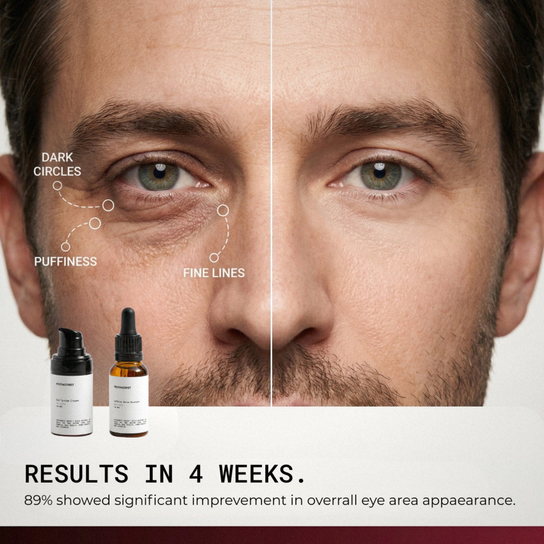 Looks rested, sharper, and more awake. Less under eye swelling, smoother texture, and improved tone over time.