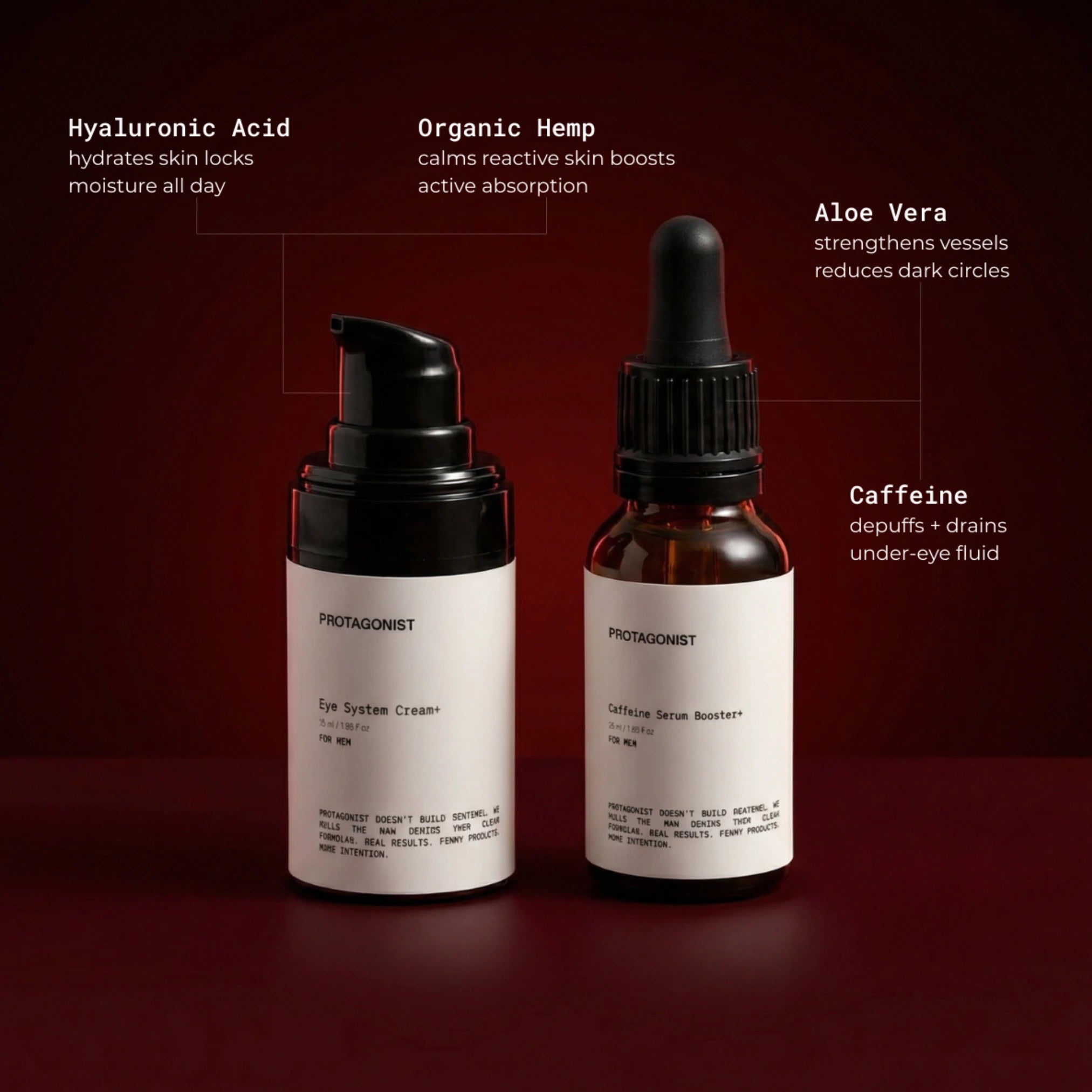 Hyaluronic Acid to hydrate and smooth fine lines. Caffeine to visibly de puff and energize the eye area. Organic Hemp and Aloe Vera to comfort, support the barrier, and reduce signs of irritation.
